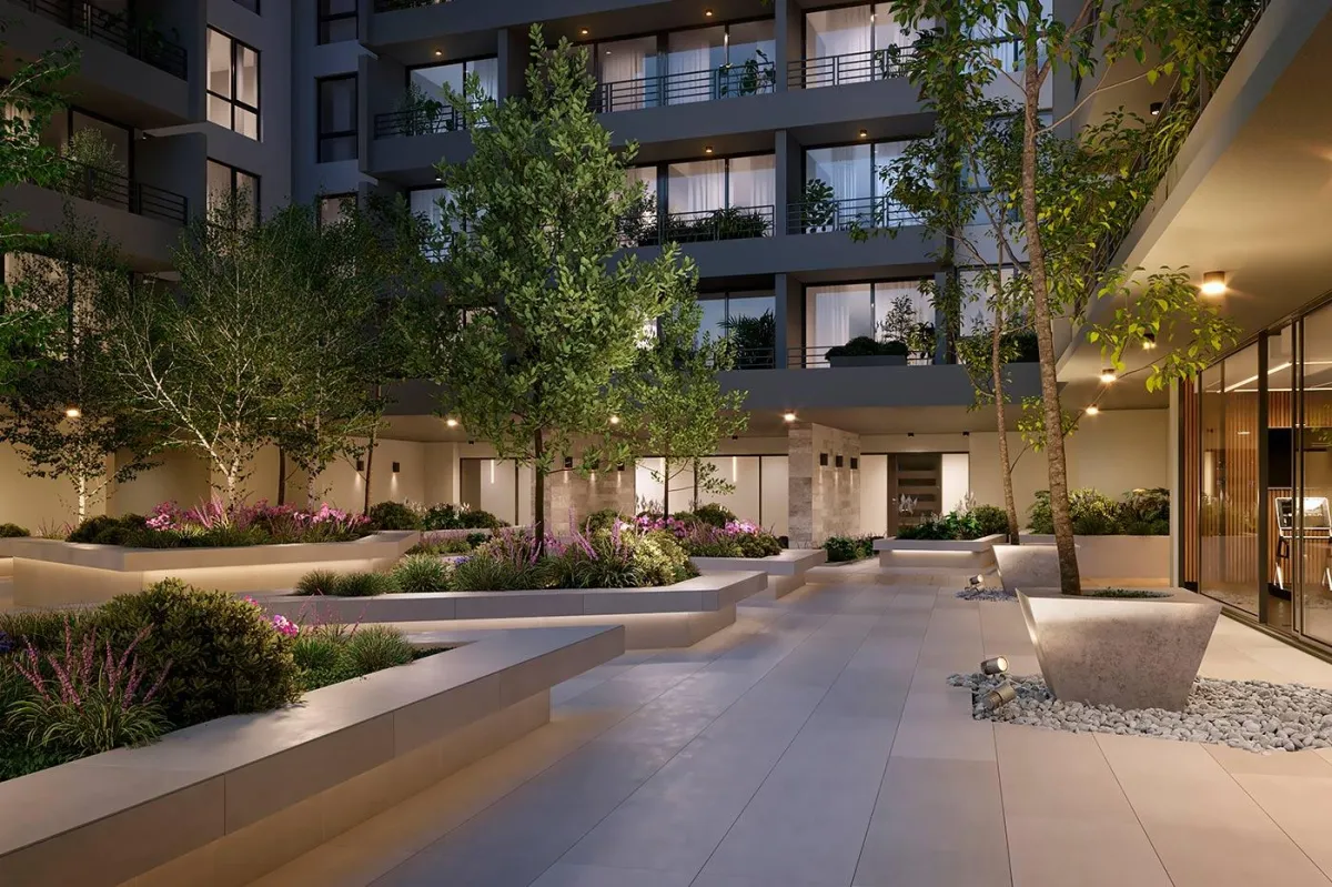 Un espacio verde privado que rodea el edificio y conecta con áreas comunes.